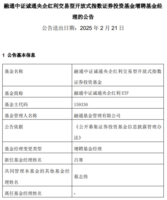 中国经济网北京2月21日讯 今日,融通基金管理有限公司公告称,融通中证诚通央企红利ETF(159336)增聘基金经理吕寒。
