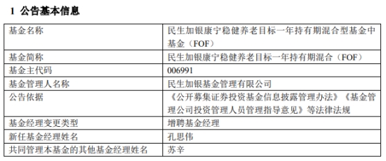 民生加银康宁稳健养老目标一年持有期混合增聘孔思伟
