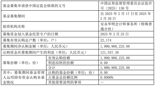 募集期间净认购金额1,999,988,225.00元,认购资金在募集期间产生的利息121,557.30元,募集份额合计1,999,988,225.00份。