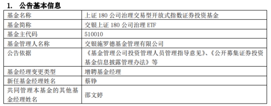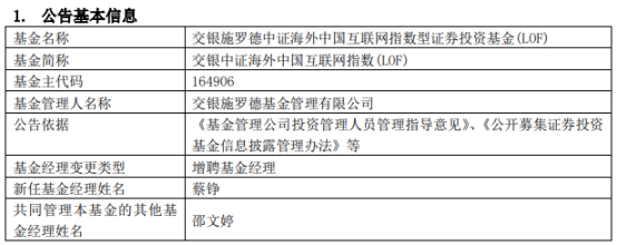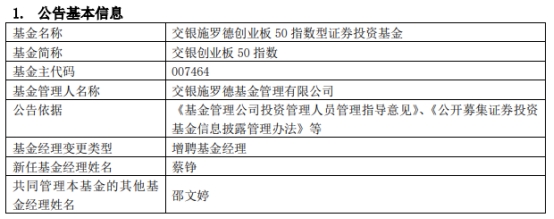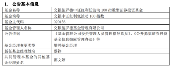 中国经济网北京2月27日讯 今日,交银施罗德基金管理有限公司公告称,交银中证海外中国互联网指数(LOF)(A类164906;C类013945)、交银上证180公司治理ETF(510010)、交银中证红利低波动100指数(A类020156;C类020157)、交银创业板50指数(A类007464;C类007465;Y类022934)增聘基金经理蔡铮。
