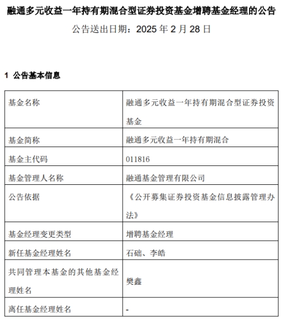 中国经济网北京2月28日讯 今日,融通基金管理有限公司公告称,融通多元收益一年持有期混合(011816)增聘石础、李皓。