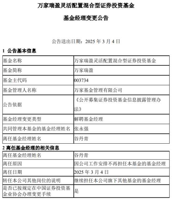 中国经济网北京3月4日讯 今日,万家基金管理有限公司公告称,谷丹青因公司工作安排离任万家瑞盈灵活配置混合(A类003734;C类003735)。