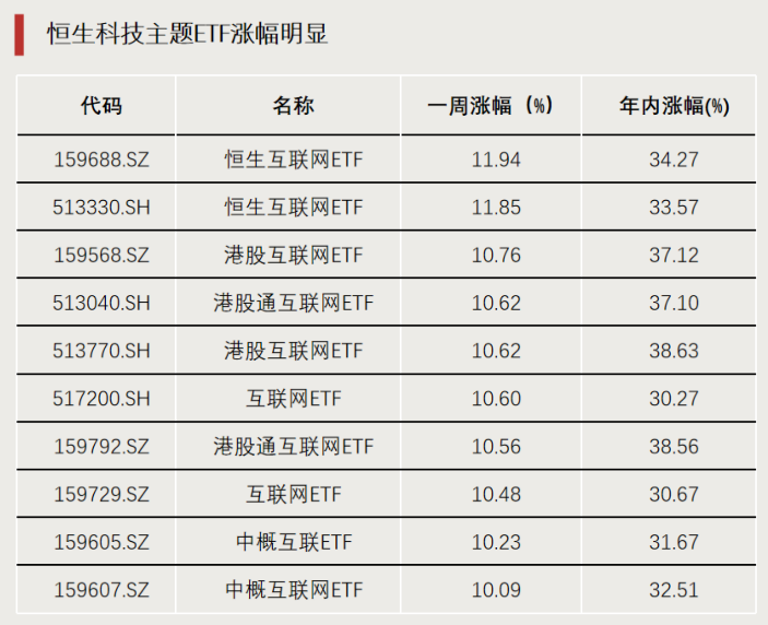 上周,全市场有超900只ETF实现正收益,正收益占比超90%。其中,多只恒生科技主题ETF表现强势,港股通互联网ETF(513040)、中概互联网ETF(159607)等多只产品周涨幅超10%。拉长时间来看,多只恒生科技主题ETF年内涨幅已经超过30%。