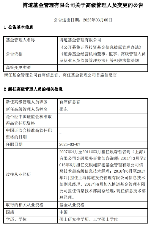 中国经济网北京3月10日讯 近日,博道基金管理有限公司发布高级管理人员变更的公告。公告称,邵东任博道基金首席信息官。张丽继续担任公司首席运营官(副总经理级),不再兼任首席信息官。