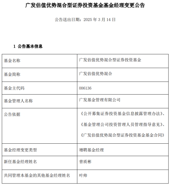 中国经济网北京3月14日讯 今日,广发基金管理有限公司公告称,广发估值优势混合(A类006136;C类011430)增聘基金经理曾质彬。