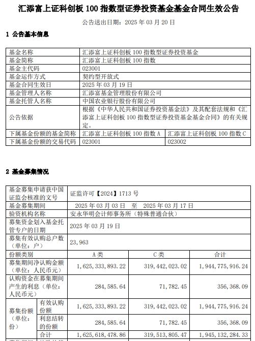 该基金募集期间净认购金额合计1,944,775,916.24元,认购资金在募集期间产生的利息合计356,368.09元,募集份额合计1,945,132,284.33份。