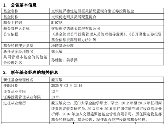 交银优选回报灵活配置混合增聘魏玉敏