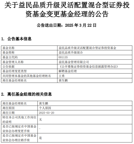 中国经济网北京3月24日讯 近日,益民基金管理有限公司公告称,黄生鹏离任益民品质升级混合(A类001135;C类020970)。