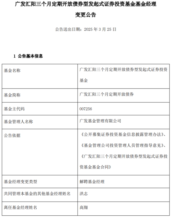 高翔离任广发汇阳三个月定期开放债券