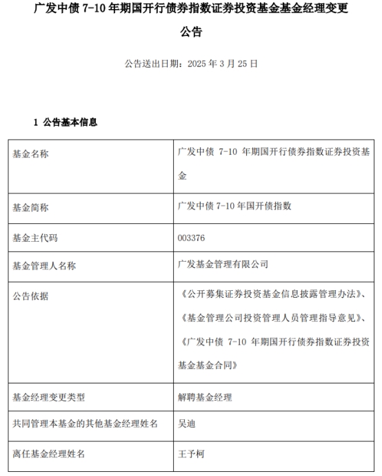 王予柯离任广发中债7-10年国开债指数