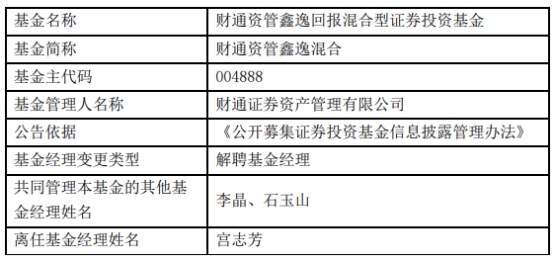 宫志芳离任原因为公司内部工作调整,其仍担任财通资管鸿利中短债债券型证券投资基金、财通资管稳兴丰益六个月持有期混合型证券投资基金、财通资管中债1-3年国开行债券指数证券投资基金、财通资管丰乾39个月定期开放债券型证券投资基金、财通资管双鑫一年持有期债券型证券投资基金和财通资管睿安债券型证券投资基金基金经理。