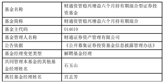 中国经济网北京3月31日讯 近日,财通证券资产管理有限公司公告称,宫志芳离任财通资管鑫逸混合(A类004888;C类004889;E类018041)、财通资管积极收益债券(A类002901;C类002902;E类006162)、财通资管稳兴增益六个月持有期混合(A类014619;C类014620)。