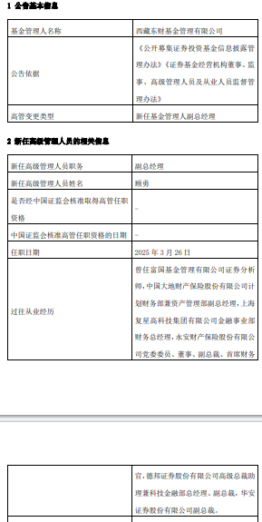 中国经济网北京3月26日讯 今日,西藏东财基金公告,西藏东财基金任命顾勇为副总经理。