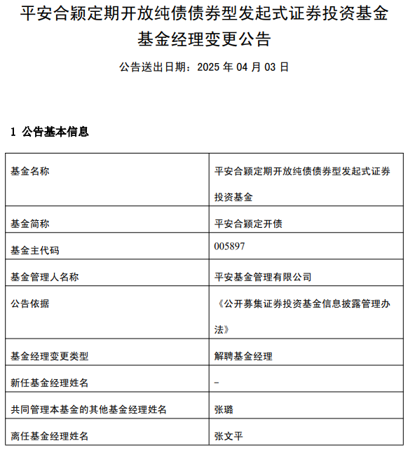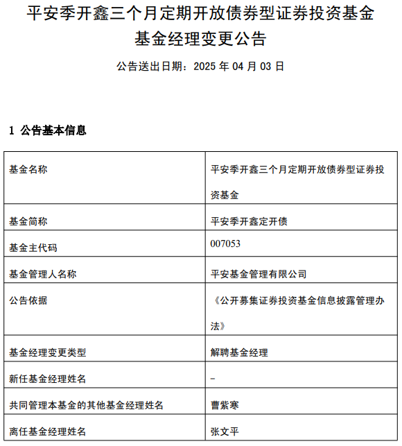 中国经济网北京4月3日讯 今日,平安基金管理有限公司公告称,张文平离任平安合颖定开债(005897)、平安季开鑫定开债(A类007053;C类007054;E类007055)。