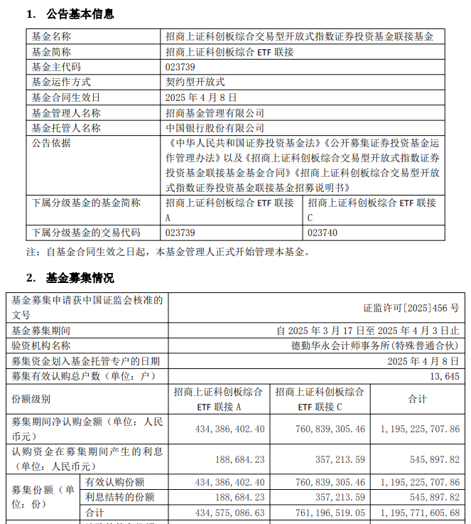 招商上证科创板综合ETF联接成立 募集净额12亿元