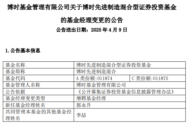 中国经济网北京4月9日讯 今日,博时基金管理有限公司公告称,博时先进制造混合增聘基金经理郭永升。