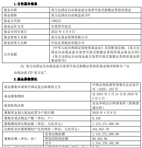 易方达国证自由现金流ETF成立 规模11.54亿元