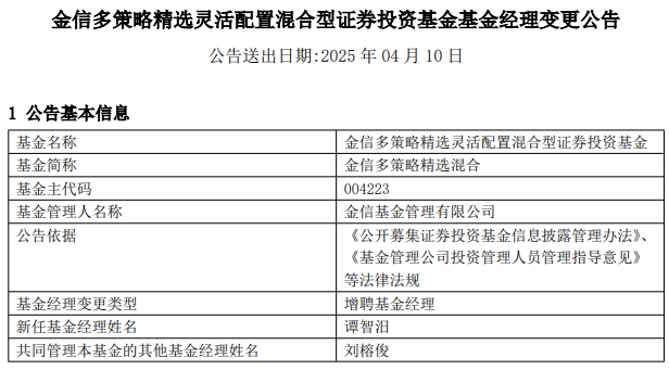 中国经济网北京4月10日讯 今日,金信基金管理有限公司公告称,金信多策略精选混合(A类004223;C类020592)增聘基金经理谭智汨。