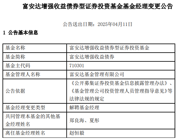 赵恒毅离任富安达增强收益债券