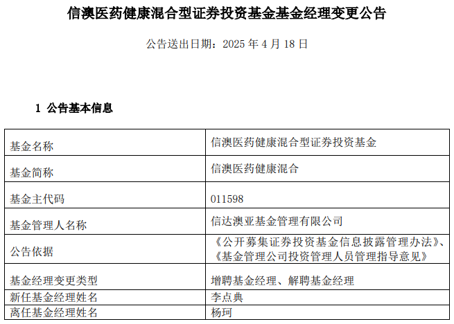 中国经济网北京4月18日讯 今日,信达澳亚基金管理有限公司公告称,信澳医药健康混合(011598)增聘李点典,杨珂离任。