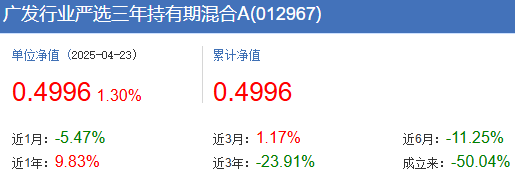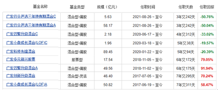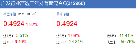 从天天基金网公布的数据来看,在目前刘格菘管理的基金中,广发行业严选三年持有期混合A/C是其累计收益率最差的,其管理不足4年任职回报跌幅超过50%,截止到今年4月23日,累计净值仅为0.4996元、0.4924元。