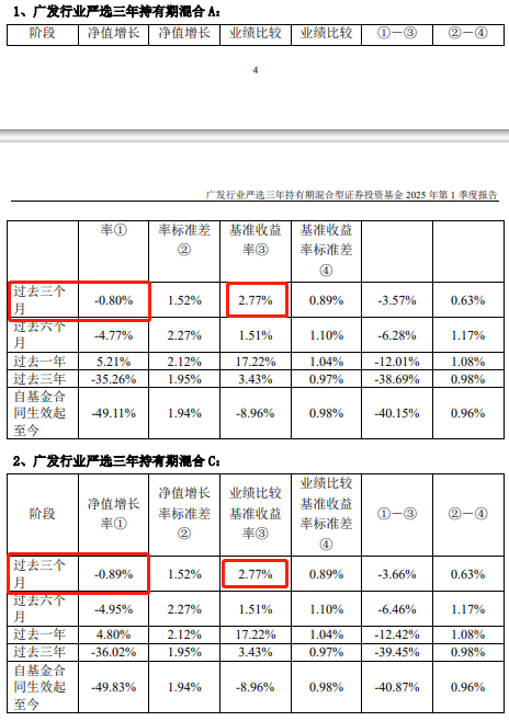 广发行业严选三年的一季报显示,该基金A/C份额收益率为-0.80%和-0.89%,而其业绩比较基准收益率为2.77%。