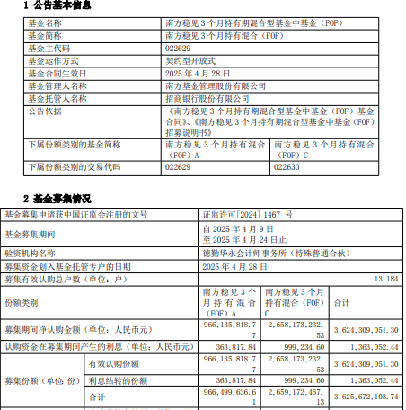 南方稳见3个月持有混合FOF成立 规模36.26亿元
