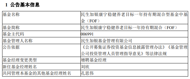 民生加银康宁稳健养老目标一年持有期混合增聘刘欣
