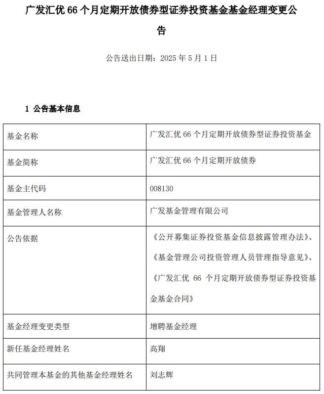 中国经济网北京5月6日讯 近日,广发基金管理有限公司公告称,广发汇优66个月定期开放债券(008130)增聘基金经理高翔。