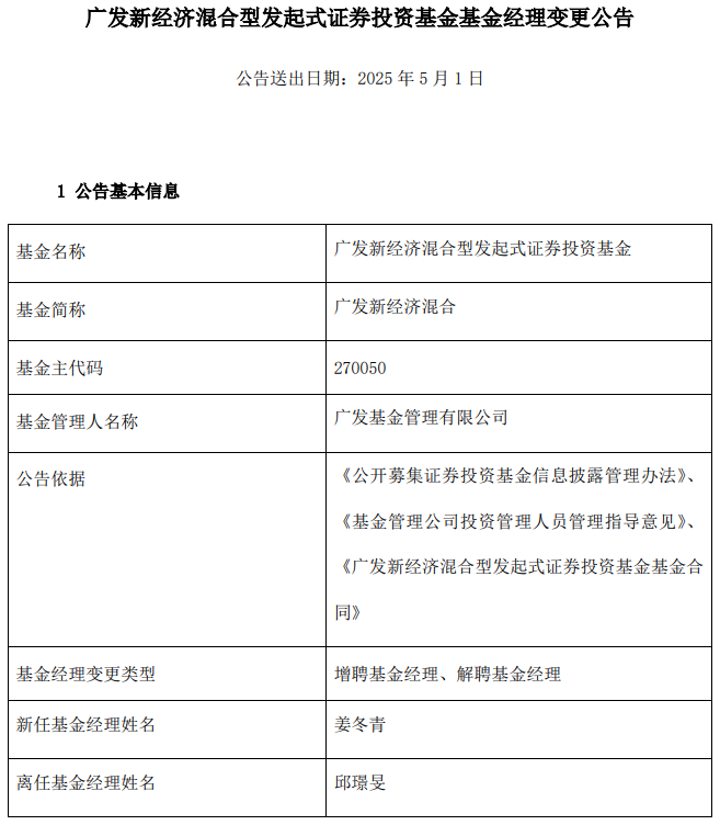 广发新经济混合增聘姜冬青 邱璟旻离任