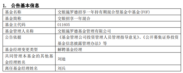 中国经济网北京5月8日讯 今日,交银施罗德基金管理有限公司公告称,刘兵因工作安排离任交银招享一年混合(A类011605;C类011606)。