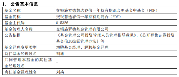 交银慧选睿信一年持有期混合增聘刘迪 刘兵离任