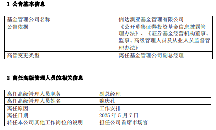 中国经济网北京5月8日讯 今日,信达澳亚基金公告,副总经理魏庆孔离任,转任公司首席市场官。