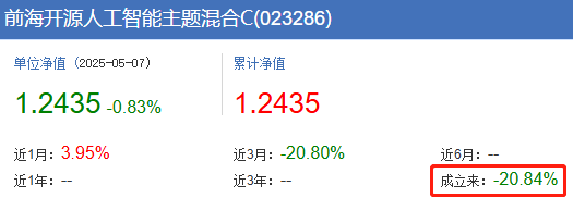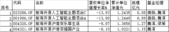 其中,由曲扬与魏淳二人共同管理的前海开源人工智能主题混合C、前海开源人工智能主题混合A跌幅最大,分别下跌了13.93%、13.90%。令人惊愕的是,前海开源人工智能主题混合C成立于今年1月20日,但截至今年5月7日收盘,该份额已经下跌了20.84%。
