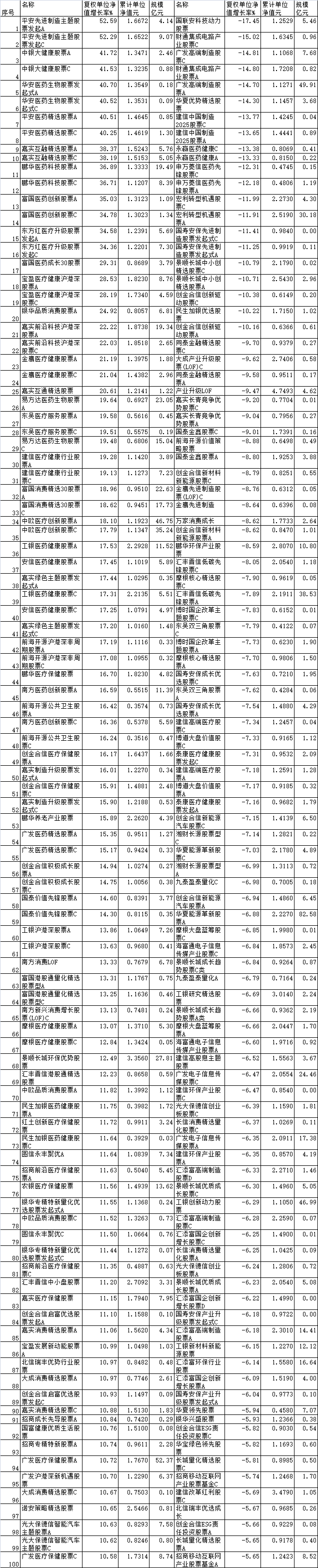 此外,受到医药股上涨的影响,中银大健康股票A、中银大健康股票C、华安医药生物股票发起式A、华安医药生物股票发起式C、平安医药精选股票A、平安医药精选股票C在今年前4月的涨幅分别为41.72%、41.53%、40.70%、40.52%、40.51%、40.25%。