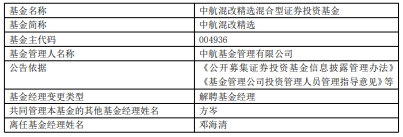 中国经济网北京5月12日讯 近日,中航基金公告,邓海清离任中航混改精选,方岑管理。