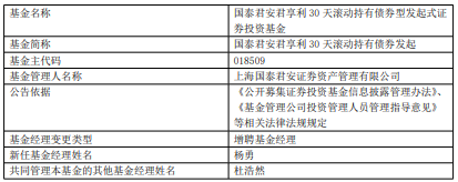 国泰君安君享利30天滚动持有债券发起增聘杨勇