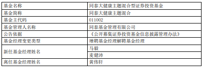 中国经济网北京5月13日讯 今日,同泰基金公告,同泰慧择混合、同泰大健康主题混合增聘马毅、麦健沛,黄伟轩离任。