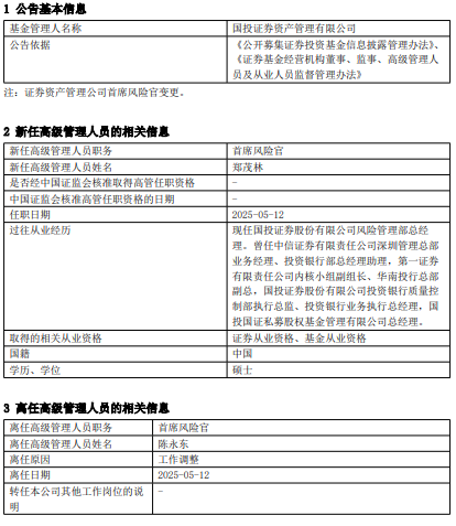 国投证券资管任命郑茂林为首席风险官 陈永东离任