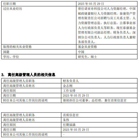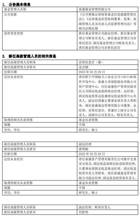 泰康基金多名高管变更 金志刚离任财务负责人