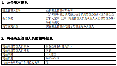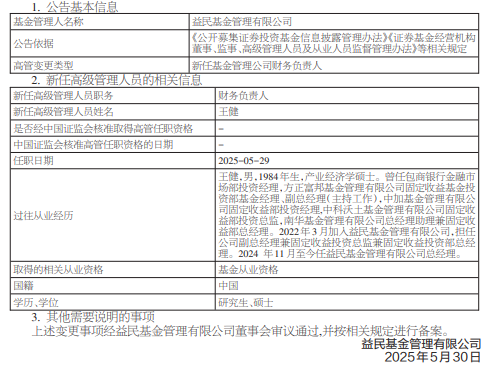 中国经济网北京5月30日讯 今日,益民基金公告,任命王健为财务负责人,副总经理兼财务负责人李静离任。
