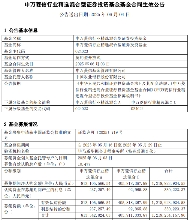 中国经济网北京6月4日讯 今日,申万菱信基金管理有限公司发布申万菱信行业精选混合型证券投资基金基金合同生效公告。