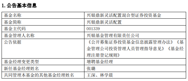 中国经济网北京6月17日讯 今日,兴银基金管理有限责任公司公告称,兴银鼎新灵活配置混合(A类001339;C类021969)增聘基金经理张璐。