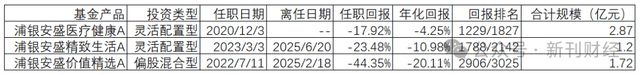 此次公告的浦银安盛精致生活,在公司前首席投资官吴勇任职近12年的时间里,曾创下任职回报225.78%、年化回报10.49%的亮眼业绩。胡攸乔接棒后,非但未能延续前任的辉煌,反倒在市场震荡中交出任职亏损23.48%的惨淡答卷。其黯然卸任亦成为投资者“用脚投票”的现实注脚。