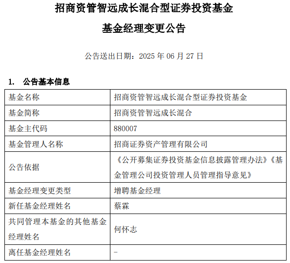 中国经济网北京6月27日讯 今日,招商证券资产管理有限公司公告称,招商资管智远成长混合(A类880007;C类881007)增聘基金经理蔡霖。