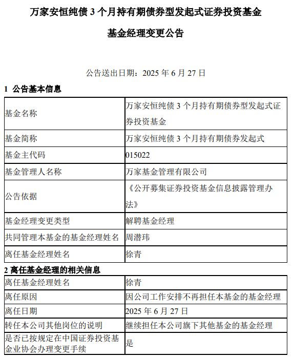 中国经济网北京6月27日讯 今日,万家基金管理有限公司公告称,徐青离任万家安恒纯债3个月持有期债券发起式(A类015022;C类015023)。