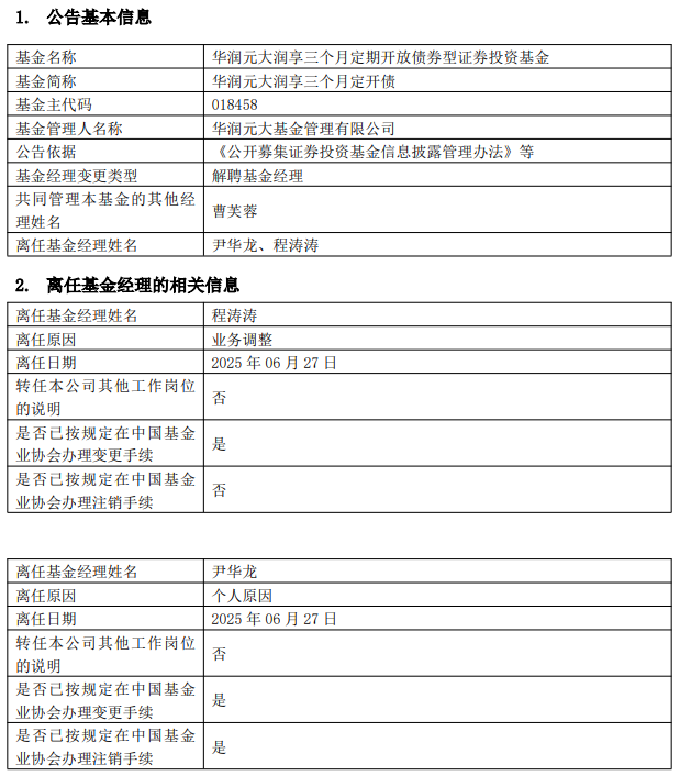 尹华龙与程涛涛离任华润元大润享三个月定开债