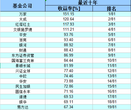 此外,平安、财通、景顺长城、华安等28家公募机构紧随其后,权益类基金近十年收益率超过50%,长期业绩较为稳健。