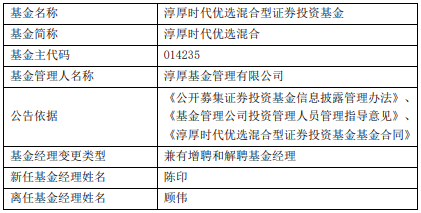 中国经济网北京7月14日讯 近日,淳厚基金公告,淳厚时代优选混合增聘陈印,顾伟离任。