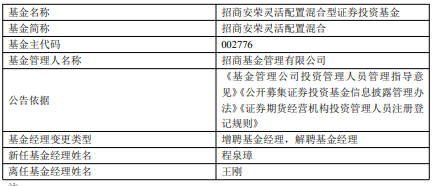 招商安荣灵活配置混合增聘程泉璋 王刚离任